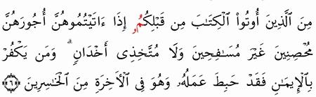 ال ي و م أ ح ل ل ك م الط ي ب ات و ط ع ام ال ذ ين أ وت وا ال ك ت اب ح ل ل ك م و ط ع ام ك م ح ل ل ه م و ال م ح ص ن ات م ن ال م ؤ م ن ات و ال م ح ص ن ات م ن ال ذ ين أ وت وا ال ك ت اب م ن ق ب ل ك م إ ذ ا آت ي ت م وه ن