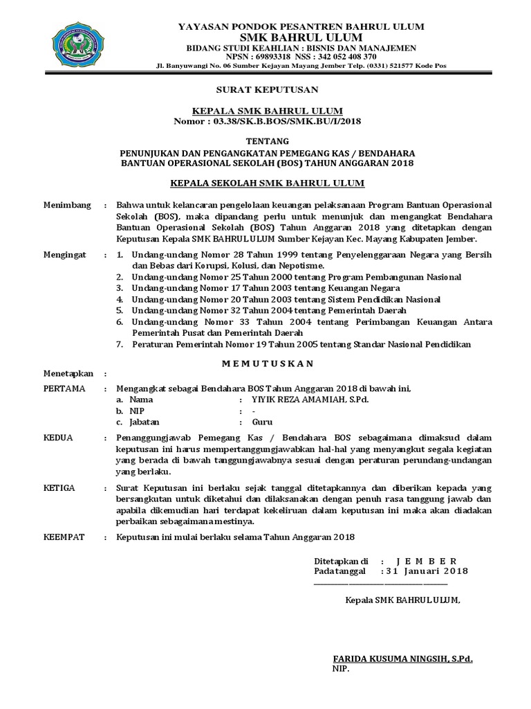 Contoh Sk Bendahara Bos Sd Smp Sma Dokumen Sekolah