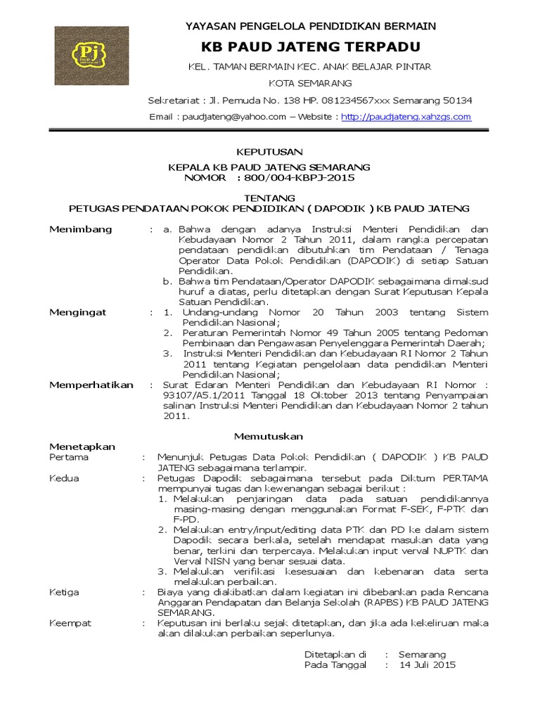 Contoh Sk Operator Dapodik Paud