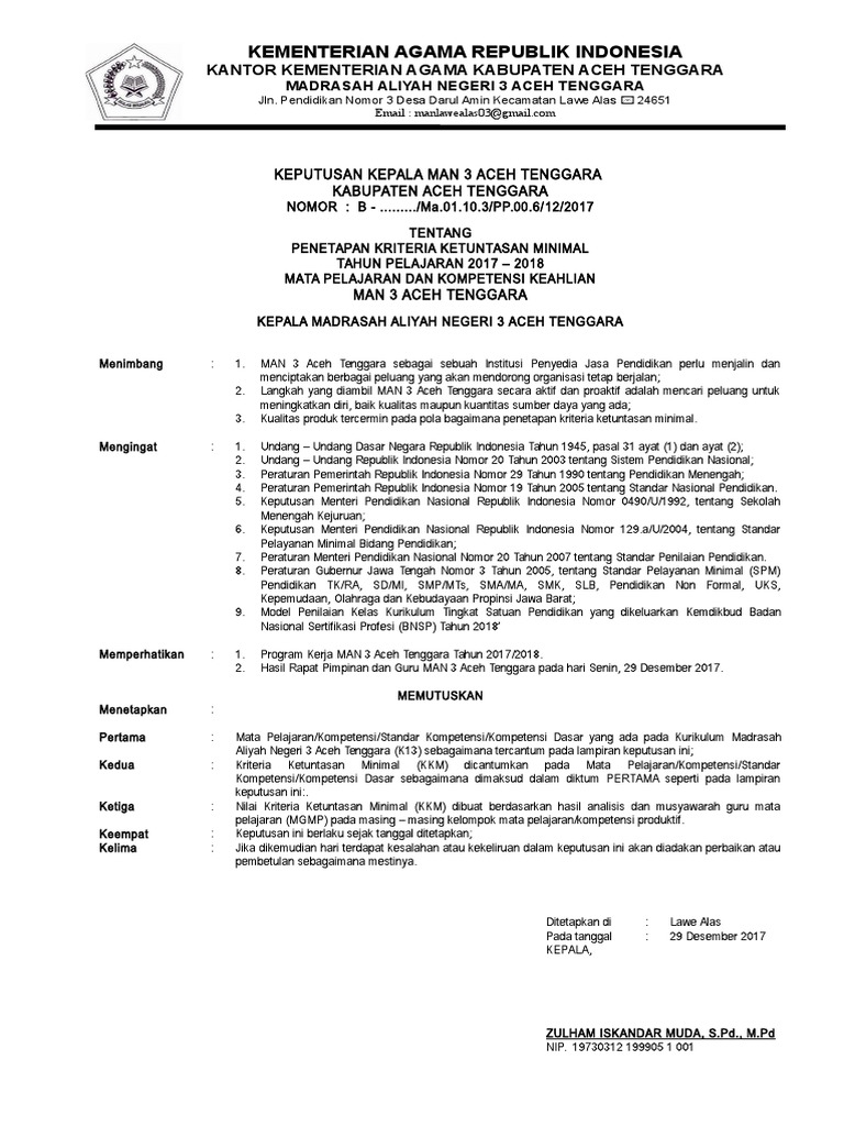 Contoh Sk Penetapan Kriteria Ketuntasan Minimal Kkm