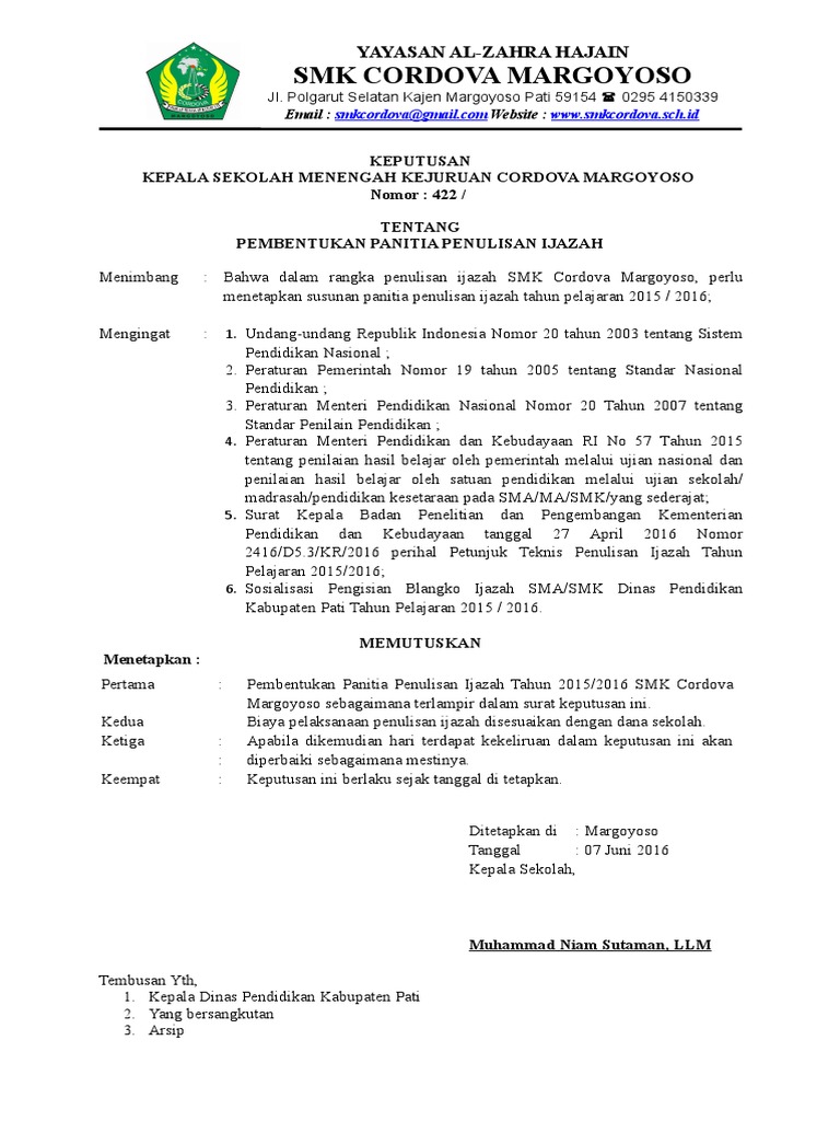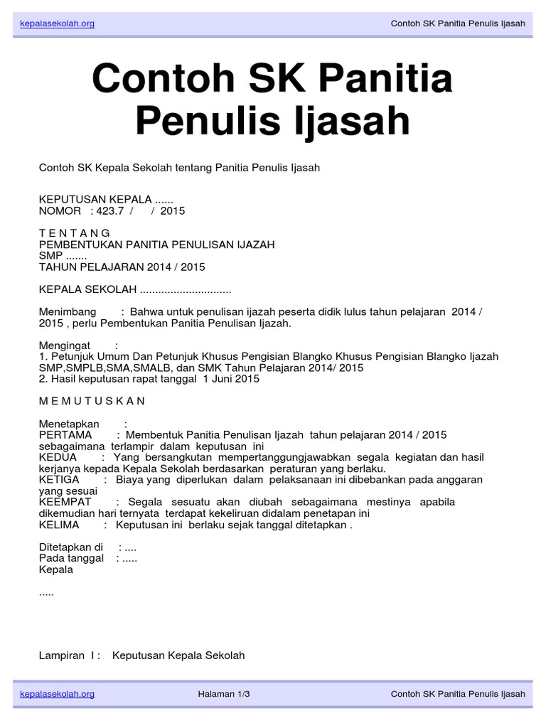Unduh Contoh Sk Panitia Penulisan Ijazah Format File