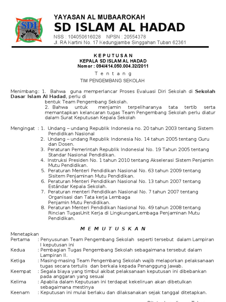 Contoh Sk Tim Pengembang Sekolah Madrasah Sidapodikdas