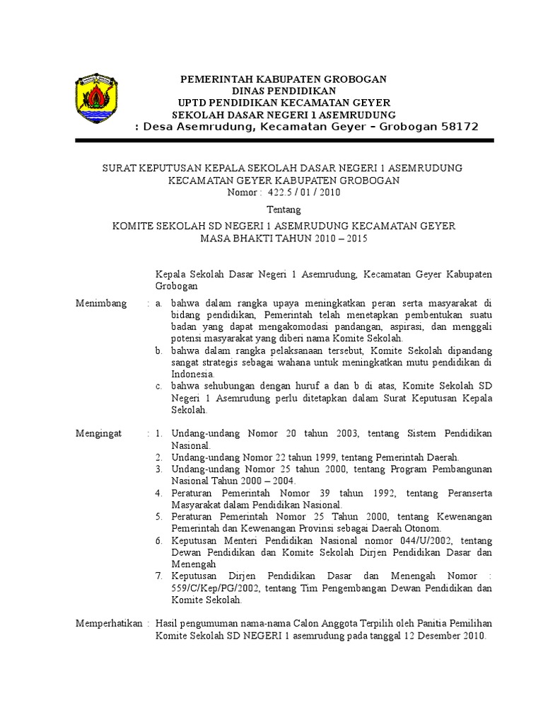 Contoh Sk Kepala Sekolah Tentang Pembentukan Komite Sekolah Sd Berkas Edukasi