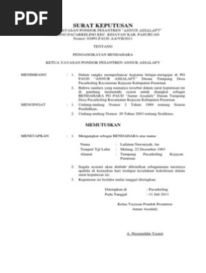 Surat Keputusan Kepala Sekolah Bendahara Paud