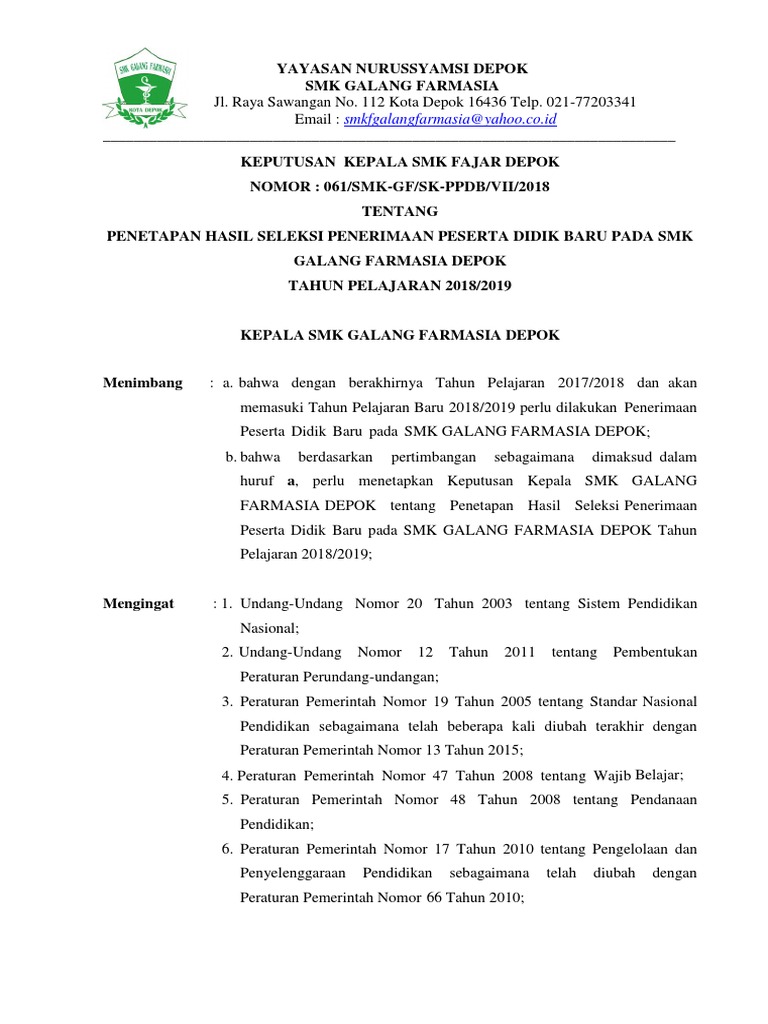 Sk Penetapan Hasil Ppdb Smk Fajar 2018 1