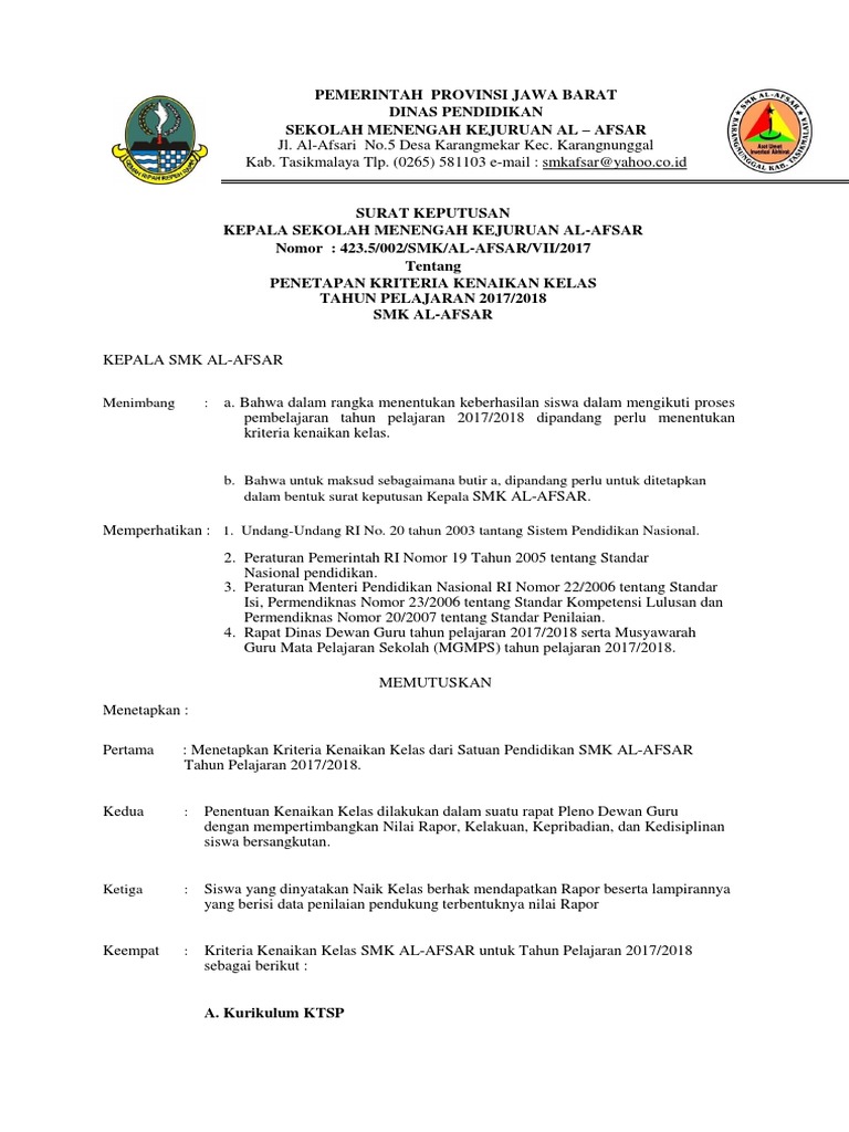 Sk Kriteria Kenaikan Kelas Smk Al Afsar 2017 2018