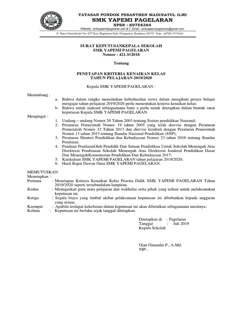 Sk Kepala Sekolah Tentang Penetapan Kelulusan Siswa Kelas Xii Tp 2018 2019