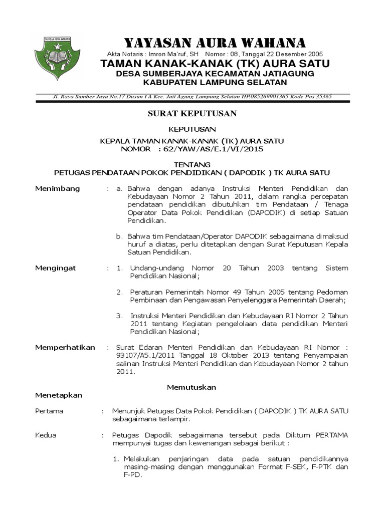 Sk Operator Dapodik Tk Aura Satu