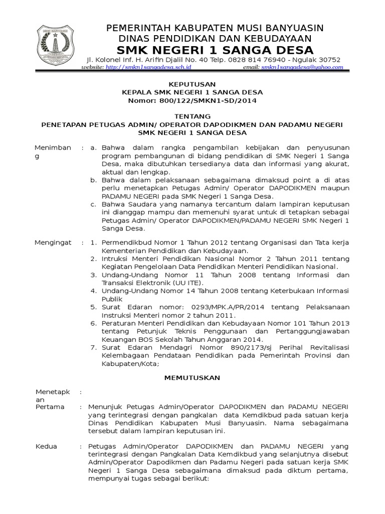 Contoh Sk Penugasan Operator Sekolah Tahun 2015 Untuk Daftar Registrasi Di Sdm Pdsp Guna Pengelolaan Verval Nisn Dadang Jsn