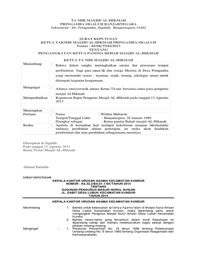 Contoh Sk Pengurus Masjid Dari Kepala Desa Doc Dapatkan Contoh