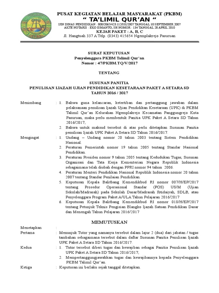 Sk Panitia Penulisan Ijazah Paket A B C