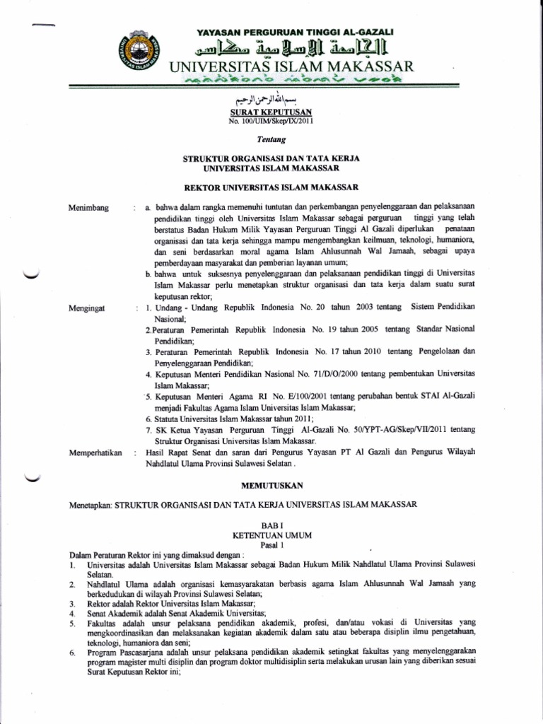 Penetapan struktur organisasi universitas islam negeri makassar dengan rahmat tuhan yang maha esa rektor universitas islam negeri alauddin makassar menimbang.
