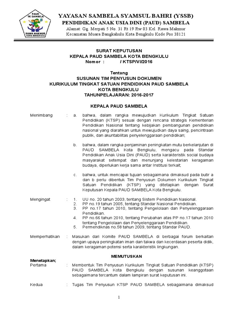 Contoh sk penetapan tim pengembangan kurikulum untuk tingkat tk paud kb hallo sahabat pengajar guru paud tk serta para operator sekolah sebagai pelengkap dalam pengembangan kurikulum salah satunya yaitu pengukuhan untuk orang orangn yang terlibat dalam pengembangan kurikulum adalah surat tugas selain sebagai dokumentasi tentu saja sebagai salah satu sarat dalam kegiatan pengembangan.